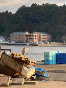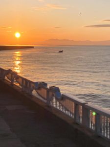 写真は能登高校南、宇出津港にある海釣り公園から見る日の出です。富山湾をはさんで立山連峰北から登っています。宇出港の隣、小木港は日本三大イカ釣り基地の一つだそうです。ちなみに、他は北海道の函館、青森の八戸です。宇出津の港を散歩したときも何隻ものイカ釣り船が係留されていました。内海の方は隆起していないようです。宇出津港と係留されているイカ釣り船です。