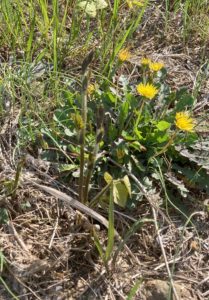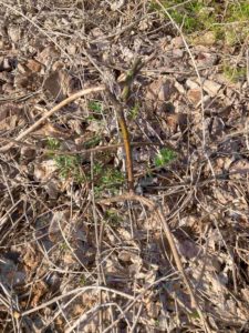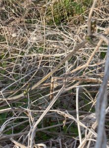 数日前から、葛も芽吹いているだろうなと思いながら歩いていました。でも気づきませんでした。昨日、刈り取られた蔓の根付いているところから小さい芽が出ているのに気づきました。菜の花やいろいろな植物の丈が高くなり、秘密のベールに包まれたように葛も芽吹いたのでした。色んなものや植物に絡むため、芽吹きとしては後発の作戦のようです。ここ数日でたんぽぽを追い越すような蔓も出てきました。ひょっとしてと思い、今日ガードレールあたり、地上1メートルくらいの蔓を観てみると出てました出てました。蔓の発芽前線は地上1メートルあたりまでです。木の上になるともうしばらく時間はかかりますよね。そう考えると、地下から発芽の栄養がドクドクと押し上げられているのが想像できます。葛の世界を感じるひと時です。(本当にそうなんでしょうか? 葛の栄養、くず粉は根もとあたりに蓄えられているので、このような想像をしたのですが)分かりにくい写真ですが草の中をじっと見てください。芽が見えてくると思われます。豆のような黒い目です。今日は鳥のさえずりだけではなく、カエルが太い声で鳴いていました。トノサマガエルでしょうか?楽しい世界です。