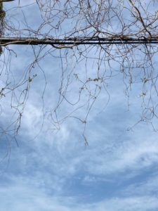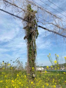 前回の報告で、葛の発芽は木の上でも活発ですよという話をしました。さらに上で見える所はないかと思い、歩いていました。電線の上はどうだろうかと見あげてみました。電線の上の蔓からも発芽していました。あんなに高いところまで水を送り栄養を下ろしているのでしょうね。そのため電信柱に巻き付いている蔓が太く太くなっています。調べると、人間の胴回りよりも太くなることがあるらしいです。すると、あの電信柱の下の葛の根には大きな芋があるということです。毎年刈り取られる葛は大きな芋を育てられないようです。土のなかや蔓の中の様子を想像するだけで面白いし、そのくず粉を料理に生かしてきた日本料理の奥深さに、それを伝えてきた日本の人たちに誇りを感じます。食べることと文化、日本各地の郷土料理食べて回りたいです。