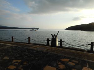 旅行記に戻ります。道の駅の中でレストランに気が付かず、広い公園の中での食事もいいかとヨモギ餅とワカメご飯を買った。なぜ、おかずを買わなかったか?覚えていない。こんな生活を続けています。午後からは、公園内を歩き回る。「百間口排水溝にいこう。」ここは始まりの地点ですから。排水溝は竹林の端に示してあったような気がしましたが、公園のマップやパンフレットには見当たらなかったように思います。(気のせいだったのでしょうか?)資料館の中では位置が示してあったと思います。竹林の端、公園の北の端に祠を発見する。発祥の地という説明書きがありました。ここが百間口排水溝の跡地です。その後、「苦海浄土」に出てくる近くの街を回ろうとしましたが、車では入れないような細い路地でした。車を海岸に置いて、しばらく歩く。昭和の趣が色濃く残った街並みでした。ただ、生活の気配があまり感じられなかったのは、皆さん移転されているのでしょうか。海岸沿いの国道まで車ででて、コインランドリーで溜まった洗濯物をする。子どもたちの下校時間と合い、とても賑やかな時間を過ごしました。また、水俣湾の公園に戻り、八代海に沈もうとする夕日の写真を沢山撮る。日が暮れてからホテルへ、フロントで「水俣のB級グルメは何ですか?」と尋ねると「ちゃんぽん」とのこと。前々日、日田でちゃんぽんをいただいたので、駅前の和食店へ、てんぷらをいただく。翌朝早い時間のワールドカップラグビー日本戦を見るため、すぐに就寝した。10時前。