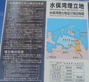 (水俣病資料館屋上より見る水俣湾と恋路島)(水俣湾の埋め立て地の看板、下には水銀を含むヘドロが閉じ込められている)