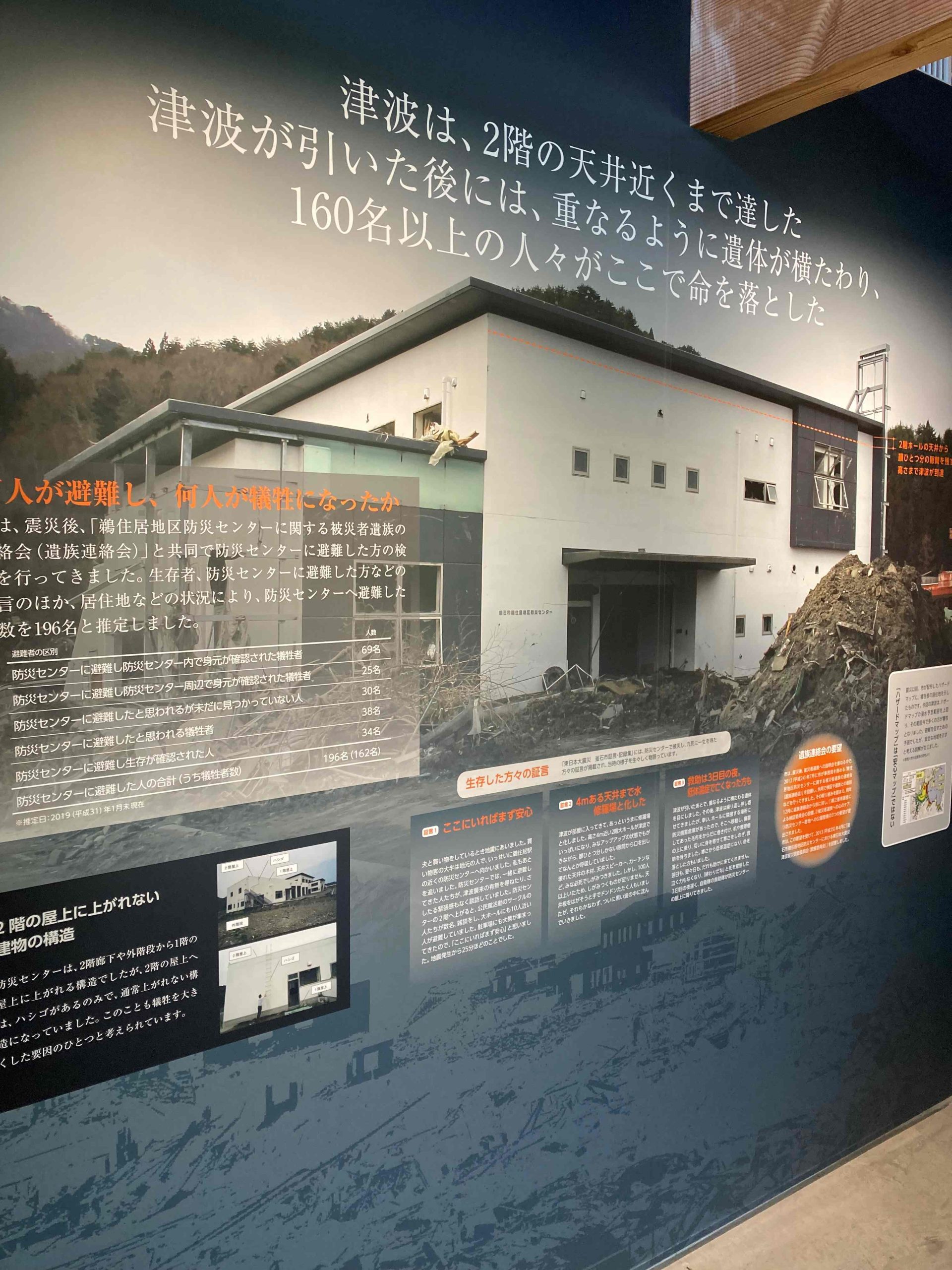 昨夜は22時ごろ就寝。6時ごろ目が覚める。しばらくゴロゴロする。ホテルの朝食、和食のビュッフェスタイル。しかっり、野菜をとる。なぜか、めかぶ納豆がとても美味しかった。産地だからだろうかと思う。この日は山田町、大槌町からスタートする。山田町の防潮堤は今までと違い山型ではなく壁のような感じがするものだった。防潮堤があると、車を停めるところを探して、停めて、上に上がり歩いてみることにする。入ってはいけないという所は下から写真を撮る。防潮堤はなぜか、万里の長城のようであった。(万里の長城に行ったことないのですが)自然と戦うために?制御するため?内側の街の様子、外側の浜辺、港の様子を写真に撮る。仕方がない事だろうが、どこも同じような景色に見える。地域の方が考えに考えた結論。釜石では少し違った、ラグビーワールドカップの際、会場になった鵜住居震災スタジアムがあり、三陸鉄道が走っていた。けれど、鵜住居地区は巨大な水門の内側にスタジアムをおいたという感じがした。住宅は戻っておらず寂しい感じがした。ラグビーの試合があると賑わうのであろうが、逆に普段は閑散としている。ここの防災センターは悲しい記憶を抱えていた。震災時防災センターに多くの方が避難してきたが、2階建ての2階まで津波が押し寄せ、屋上に上がる術はなく、160名の方がここで亡くなった痛ましい記憶です。言葉のマジックで、防災センターだから安全だろうと思われたようで、正常バイアスが働いた例と思われます。その後、大船渡市へ向かう。どこ回ろうか、迷うが掲示物に大船渡市立博物館が震災伝承施設と記載してあったのでそこへ向かう。そこは、碁石海岸国定公園内にあり、景勝地と散策ロードがある。松林も続いていた。散策路をしばらく歩く。まさしく、三陸海岸という感じのする所だった。ただ、博物館にはシアターで「荒れ狂う海~津波常習地・大船渡~」紹介はあったが、まさしく、三陸海岸というジオパークの展示が主なものであった。