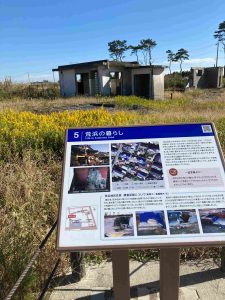 その後、浪江町の請戸小学校へ、ここでは全員が近くの山の避難地へ避難したとのこと。教頭先生は保護者の迎えに対応し、山で合流することを伝えてから避難されたとのこと。避難場所がどこにあるか、情報をどれだけ正確に把握すかで、決断はおのずと変わってくるなと思った。「命てんでんこ」が心にしみる。その後、原子力災害伝承館へ、隣にある浪江町の商工会館と伝承館立派さに唖然。更地の中に2つの建物が立っている。周りの更地は震災公園になるらしい。美しくカッコいい建物の中の原発災害の紹介は何か他人事のようで、あまり緊迫感を感じられないのはなぜでしょうか?伝承館のイメージが原発の災害を終わったことにしていませんか?と思うのは的外れでしょうか?