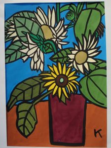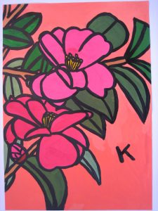 Yさんの作品は川柳をそえて生活に返していけます。他の方々はどうでしょうか。Fさんの花の作品は以前、企業の学習会の中で、コーポレイトアイデンティティを表すロゴは盛んに言われ、使われています。外向きには積極的にアイデンティティを求めて、ロゴで表していこうされていますが、社員の皆さんにはどうでしょうか。代表者が贈る言葉として、社訓という言葉ではなく、花言葉を内に抱えた花の絵を飾るということはどうでしょうかということ(分かりにくいこと)を提案しました。聞いていたみなさんはキョトンとした顔をされていました。でも、Fさんの花の作品には花言葉をそえたいと思います。