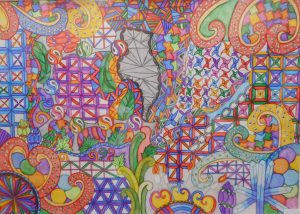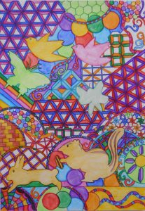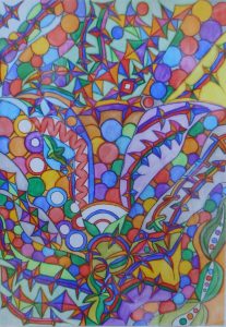次は「オクトパスワールド」です。タコの足、足、足でタコの足が植物のよう伸びています。足の吸盤は目のようで本当にオクトパスワールドです。次の「ツメツメトゲトゲ」は今までの作品作りのつながりを強く感じます。丸とトゲ、トゲがギザギザと単調に並ぶようにマルはぎゅうぎゅうになって並んでいきます。単純な形ですけれど、片方は痛々しく、片方は息苦しく感じてしまいます。