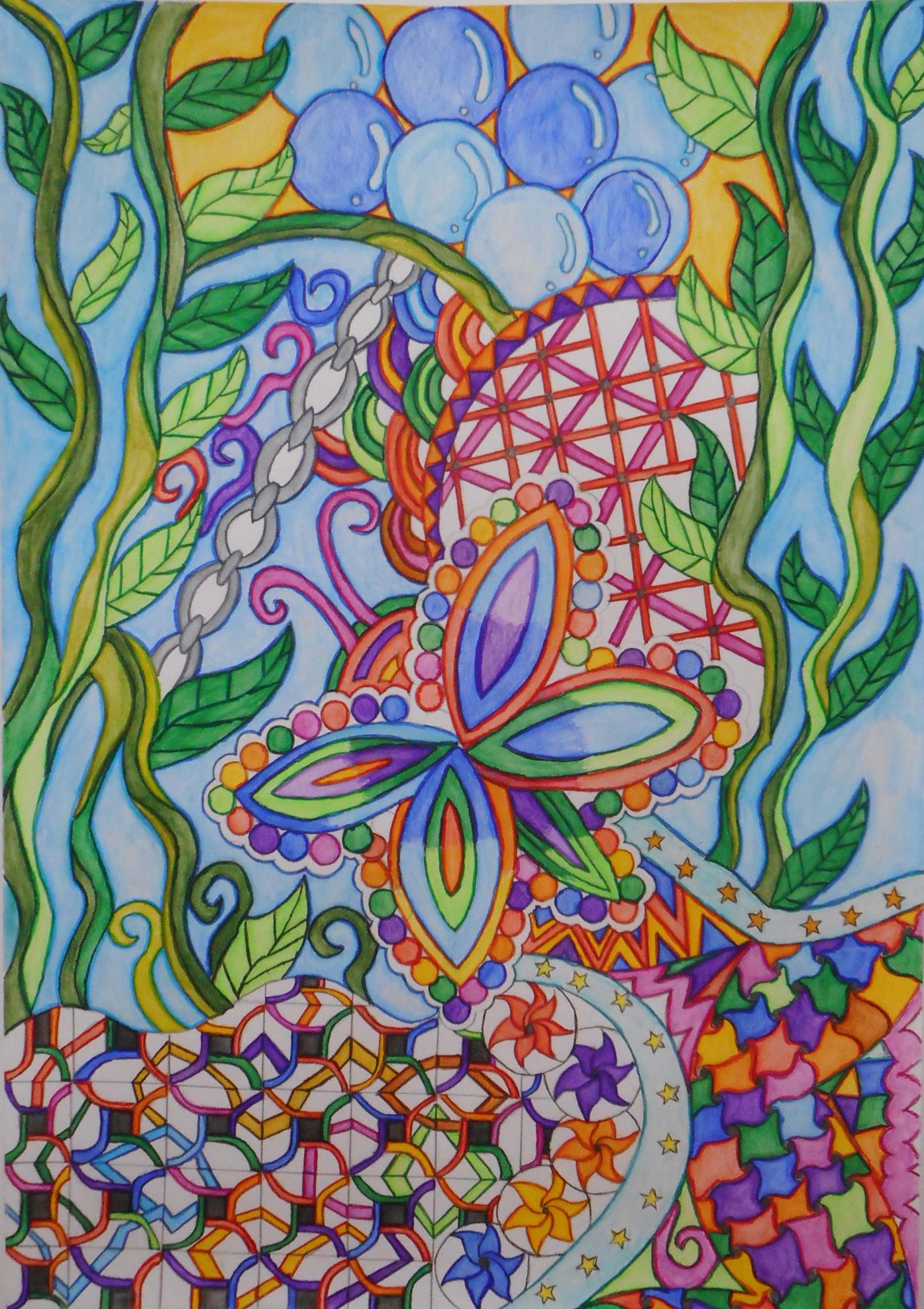 Mさん、今までののような作品作りの取り組みも充実しています。蝶の舞はあざやかにひらひらと舞っています。蝶は水中をゆれる花をあちらからこちらへと舞っているように見えます。水中に咲くバイカモは涼やかで可憐ですよねその花に舞う蝶のようです。