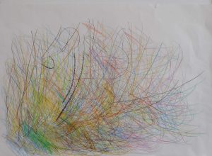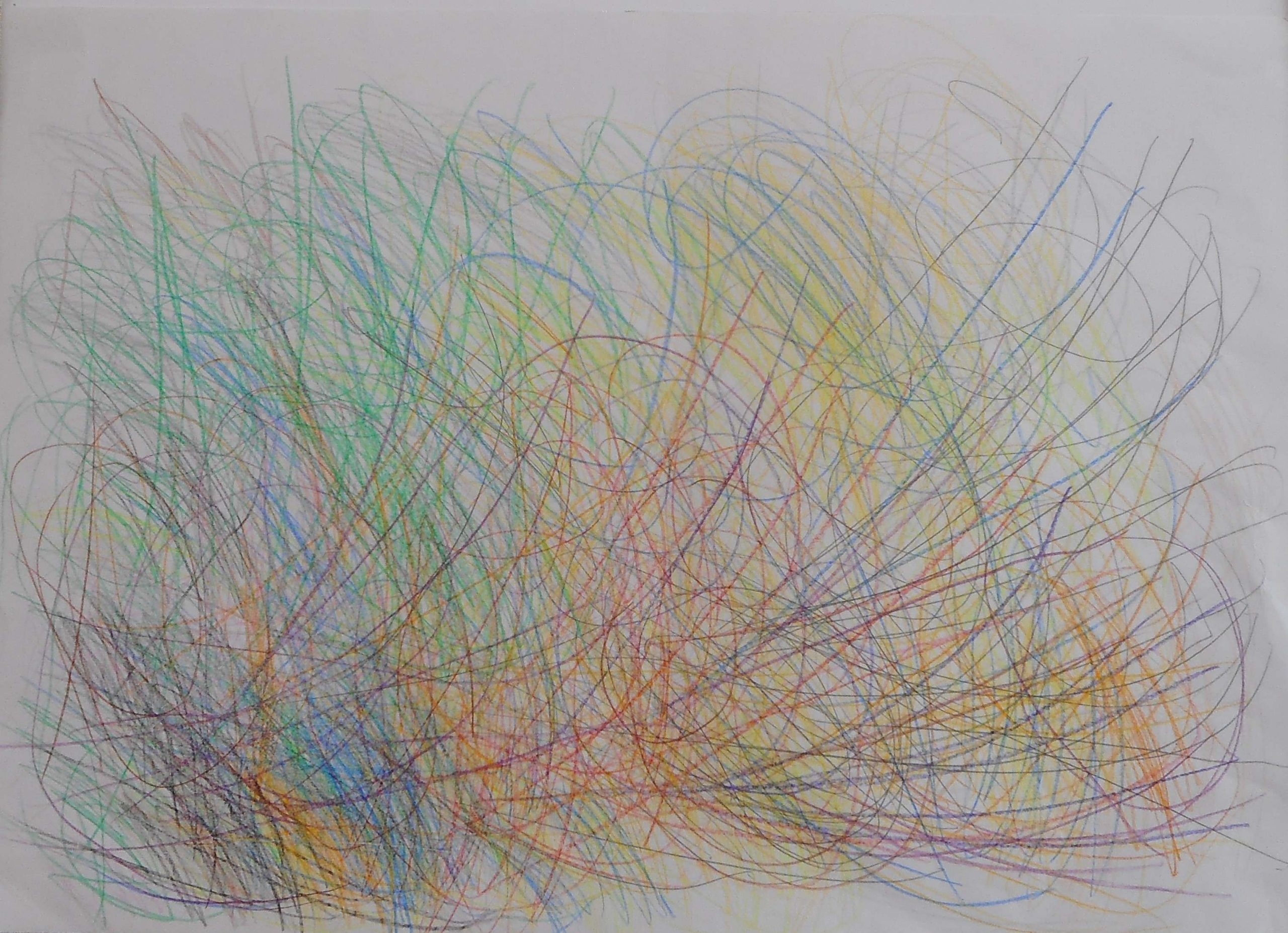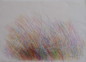Sさんの作品は色えんぴつを使ったアクションドローイングです。描かれる際にはそこに色々な会話があるようです。ここ最近で見させていただいて気づいたことはふんわりとした線に力強い線が加わってきたということです。その表現の場で落とされた、感じた言葉を発生した言葉としてお母さんが拾って題名にされたようです。エネルギッシュな作品になっています。鶴見俊輔さんがいう限界芸術、発生の場の作品になっています。どれだけ彼女の言葉を受け止めることができるでしょうか。