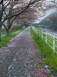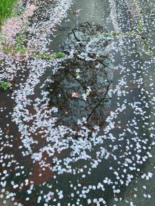 先週末の冷たい雨で、粘って、頑張って枝についていた花もみんな落ちてしまったでしょうか。葉桜も次の季節に向かうぞみたいな感じで、元気をもらえるのですが、足元のに散った花びらも良いですよ。すぐに色あせてしまいますが、雨に集められて色んな模様を作ってくれます。その水たまりに映される枝に桜が、散った桜と映った桜、水たまりをのぞき込むこんな花見もなかなかなものです。もう少しすると紅色のがくがおちて紅い絨毯のようになります。ふんわりとした感触が足裏から伝わり本当に高級な絨毯の上を歩いているようになります。ぜひ歩いてみてください。音も聞こえますよ。