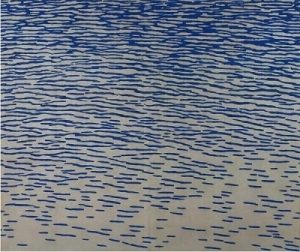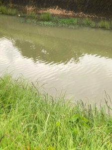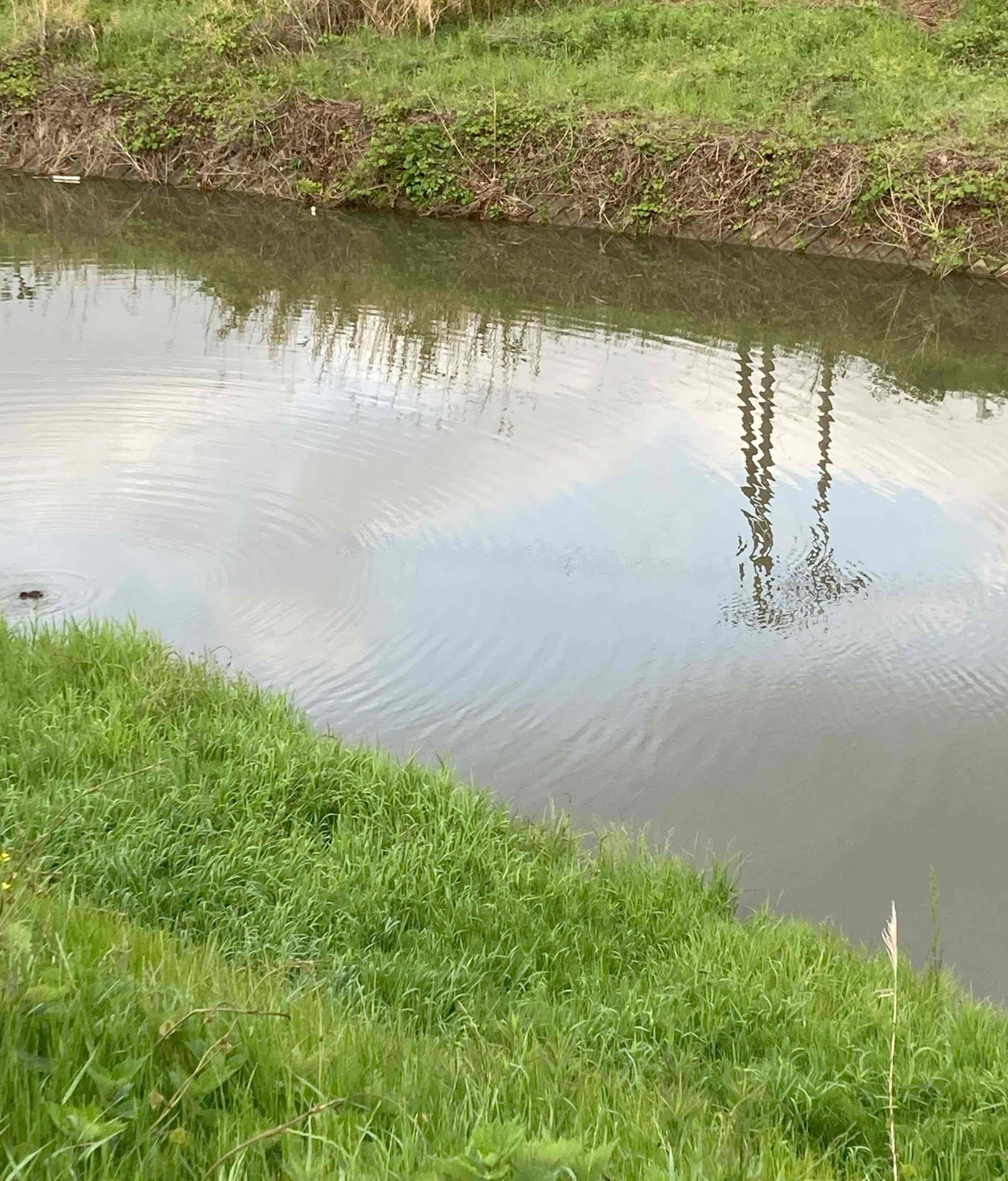 突然なのですが、福田平八郎さんの漣(さざなみ)をご存じですか。昭和7年(1932)に発表された作品です。福田さんが釣りをしている時に出会った光景を何度も何度もスケッチして描かれたとのこと、昔は粗から密、色を目で追って美しさをこの変化に感じていました。浮世絵のようなリズミカルな波は時代を貫くのかもしれません。この感じは今も変わりません。今は、昔とちょっと違い、視覚より先に風を感じることがあります。このさざ波を調べると漣、細波、小波などと記されています。さざ波とは水面を弱い風(毎秒5メートル以下、1メートル以下の時はなみができない)が、吹くときにできるしわのような波とのことです。この時期、川をせき止めて用水路に水を流すので流れのない川面に出会うのですが、両岸を土手に覆われた川面は、私たちを近づけてはくれません。さざなみは近くに感じるものではなく遠くから眺めるものになったようです。いや、水面を渡る弱い風なので出会いにくいものになってしまいました。最初の画像、カイツブリがおこした波はしわのような波になっていました。堰から用水路からあふれたり、落ちたりしてできた波は岸にぶつかり複雑な形をして強い波になっています。出会いました。今朝、25日朝の南風、土手の上では弱い風ではなかったのですが、川面はさざ波のような、、、感じがしています。人がつくった大きな溝のような川は人から離れて自然になっています。