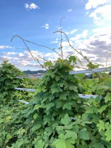 この暑い時期、葛はぐんぐん伸びておひさまを独り占めするかのように、「葛はお日様とりにいく」なのです。マントのように他の草木の上にかぶさっていきます。戦後、中国の砂漠緑化に葛が使われたそうですが、羊などの家畜が全部食べてしまったようです。日本でも「馬のぼたもち」「馬のおこわ」とか呼ばれ、牛や馬は好んで食べたそうです。人にとっても薬ですものね。