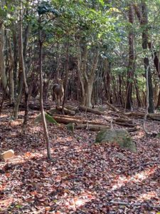 三連休の最終日、孫たちと工芸館のプラモデル展を見学しようと計画をしました。時間がたっぷりあるので秋を堪能しようと思い、以前にも彼らと歩いた自然観察の森へ出かけました。この辺りはクマらしき生き物をみかけたという情報があったので、リュックにクマよけの鈴をつけて出かけたのでした。この時期の散策は暑くもなく、寒くもなく、小春日和の快適な中での散策です。ネイチャリングセンターでマップをもらい、掲示板を頼りにコースを回っていきました。森の中は人の声はしませんが、鳥のさえずりのうるさいことうるさいこと、いっぱいお話をしてくれました。多分声をかけてくれたのだと思います。木々の間からの木漏れ日にたくさんの鹿がゆったりと日向ぼっこをしているのが見られました。本当にこちらが「おじゃまします。」という感じです。鹿は座ったまま、ジーとしてこちらを眺めています。普段とは逆に鳥や獣に監視されているような気配さえ感じたのでした。この時期でも日が当たるところにはトカゲがいるのですね、子どもたちは色んな生き物やかわったものをみつけては教えてくれます。木に出来たこぶ、はっぱのようなキノコ、彼らの後をついて行って終わったような散策でした。