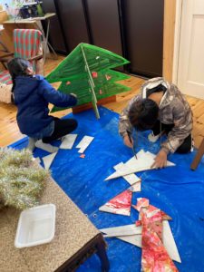 その後、アトリエにてクリスマスツリーづくりに挑戦。ダンボールの作品を再利用しました。形づくりから子どもらに任せて私はお手伝い。ダンボールカッター上手に使えなかったAも慣れてくると体を使い、ギコギコ出来ておりました。コツをつかむのが早い。子どもたちが学ぶということを体で覚えるのは、こんなところからかもしれないと思うのです。Hはツリーの上に星を作りたいとダンボールで作り始めていました。それからしばらくの間、かれは黙々と星を作っていました。そんな一所懸命の姿を見ることがとても心地よいです。ほくそ笑んでしまうのです。