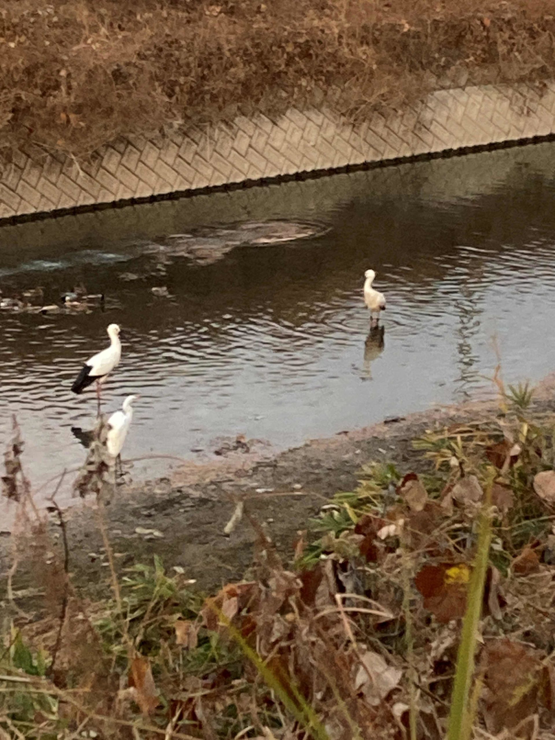 12月15日の朝に散歩コースの川でコウノトリ2羽に出会ったのですが、カメラのバッテリーが減っていて写真がうまく撮れませんでした。この2羽がやってきたのは、秋までの間、川が堰き止められて、そのが水が抜かれたため逃げ遅れた魚が浅瀬にたくさんいたのでしょう。その数日前、鳶がたくさん川底に下りていたのを思い出しました。コウノトリはそんな餌場を偶然見つけて立ち寄ったのだろうと思っていました。その後もこのあたりにいたのか分かりませんが、5日後の朝、再び2羽のコウノトリに遭遇しました。写真は撮れたのですが、足輪を確認するまで鮮明な写真は撮れませんでした。その後、コンパクトカメラを携帯して散歩に出かけるようにしています。また、その日朝焼けに雲がオレンジになった後、虹の両側の端だけが現れました。この虹も名前あったりするのでしょうか?環天頂アークが見られたと最近ニュースで言っていました。天頂の方では逆さ虹が出ていたのかもしれません。わかりません。気づきませんでした。