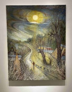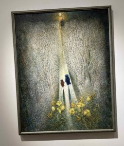 山本さんのプロフィールでは、「山本一雄(1936~)は岡山県瀬戸内市にある長島愛生園で暮らしながら、89歳になる現在も毎日自身の表現と向き合いながら絵を描く画家です。、、、長島愛生園は、日本に初めてできた国立ハンセン病療養所です。山本は故郷や家族と離れ、30代で長島愛生園に入所します。今ではハンセン病は完治しているにもかかわらず、今でも長島愛生園で暮らしながら、絵を描いています。」ということです。小さな部屋で自分と向き合い掘り下げていく中で生まれてきた作品たちを見せていただきました。松本清張の砂の器をモチーフにした作品、風が冴える美しい景色は歴史の重さまでも響かせてきます。毎日描かれた筆致が積みあがったマチエールはその過ぎ去った時間として表現されていました。
