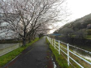 4月の2日 雨上がりの朝でした。「雨上がりの朝、届いたみじかい手、、、。」ついつい口ずさんでしまうしまう 名曲ですよね。なんてウキウキするのです。雨粒が朝日を浴びてキラキラしています。ガードレールの下にしづくが並んでいます。見上げると日が当たっている所だけ竹藪の笹の葉が輝いています。そこに、うぐいすのつややかな音色が響いています。頬には爽やかな空気を感じ、いろんな鳥の鳴き声を聞いて、キラキラした世界をながめます。眼を閉じたり、薄目をして見たり、音に集中したり、輝きに変化を与えて見たりしていました。また、「しあわせ?」ってつぶやいてしまっていました。サクラの花が開花する頃は少し寒く、花は一度にパーって咲かないんだなと思っていたのですが、先日のニュースの中で気象予報士の方が冬場の水不足が桜の開花に影響を与えていると言われていました。木の中が潤沢な水分量ではないので一度に咲かないのだそうです。そう言われてみれば、花は幹、地面に近い所から咲いています。高い枝先の方は蕾が多いですね。足もと芝のような草にクモの巣を見つけました。いろんな生き物が活動をはじめました。